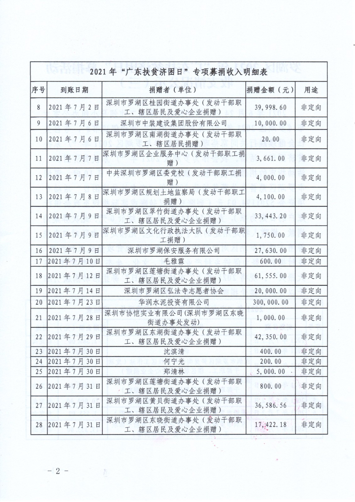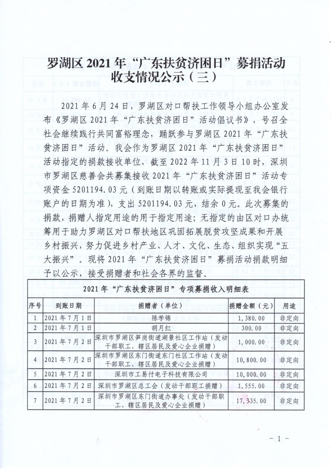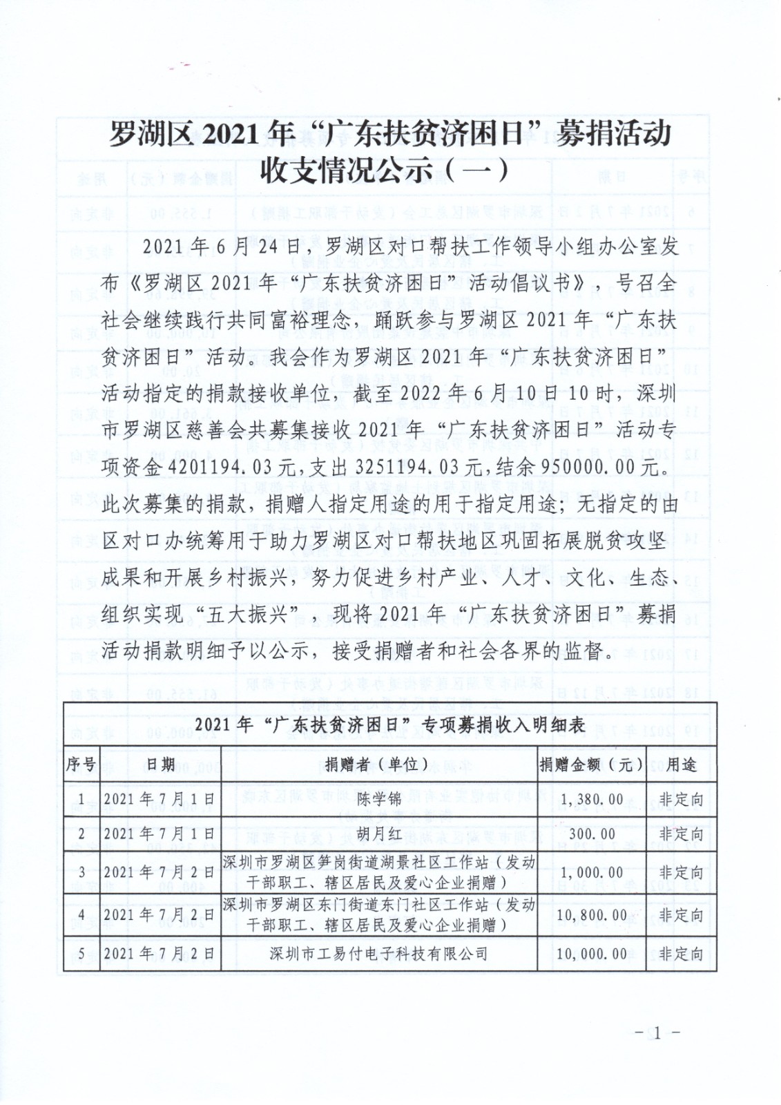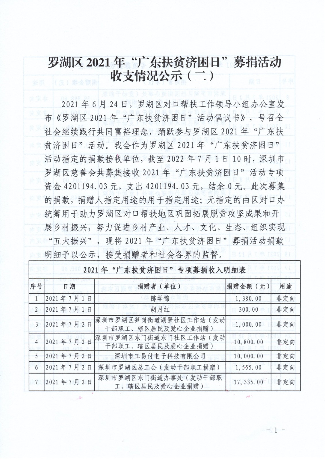 2021年6月24日,罗湖区对口帮扶工作领导小组办公室发布《罗湖区2021年“广东扶贫济困日”活动倡议书》,号召全社会继续践行共同富裕理念,踊跃参与罗湖区2021年“广东扶贫济困日”活动。深圳市罗湖区慈善会作为罗湖区2021年“广东扶贫济困日”活动指定的捐款接收单位,截至2022年7月1日10时,共募集接收2021年“广东扶贫济困日”活动专项资金4201194.03元,支出4201194.03元,结余0元。此次募集的捐款,捐赠人指定用途的用于指定用途;无指定的由区对口办统筹用于助力罗湖区对口帮扶地区巩固拓展脱贫攻坚成果和开展乡村振兴,努力促进乡村产业、人才、文化、生态、组织实现“五大振兴”。