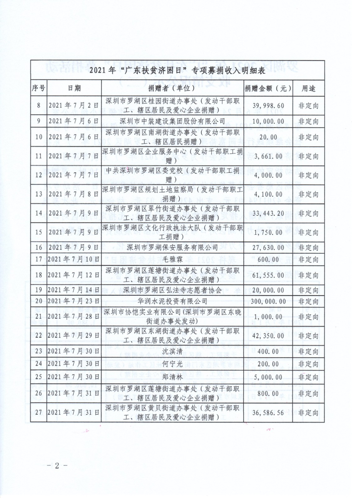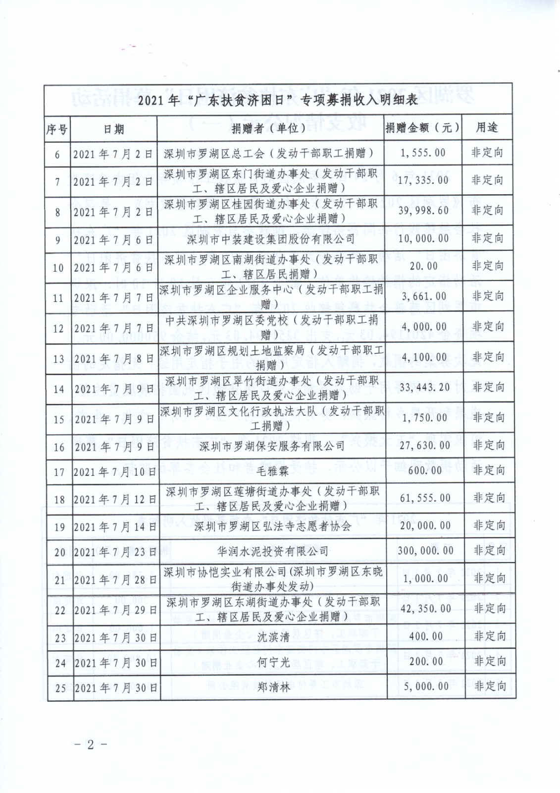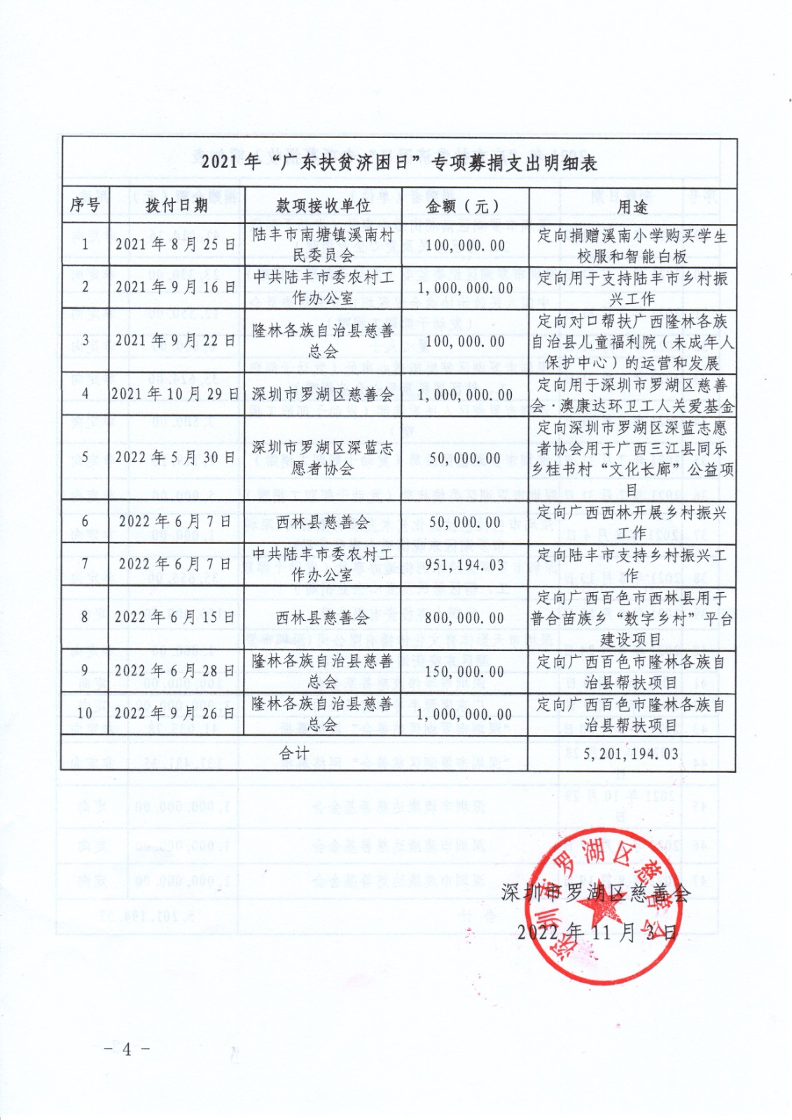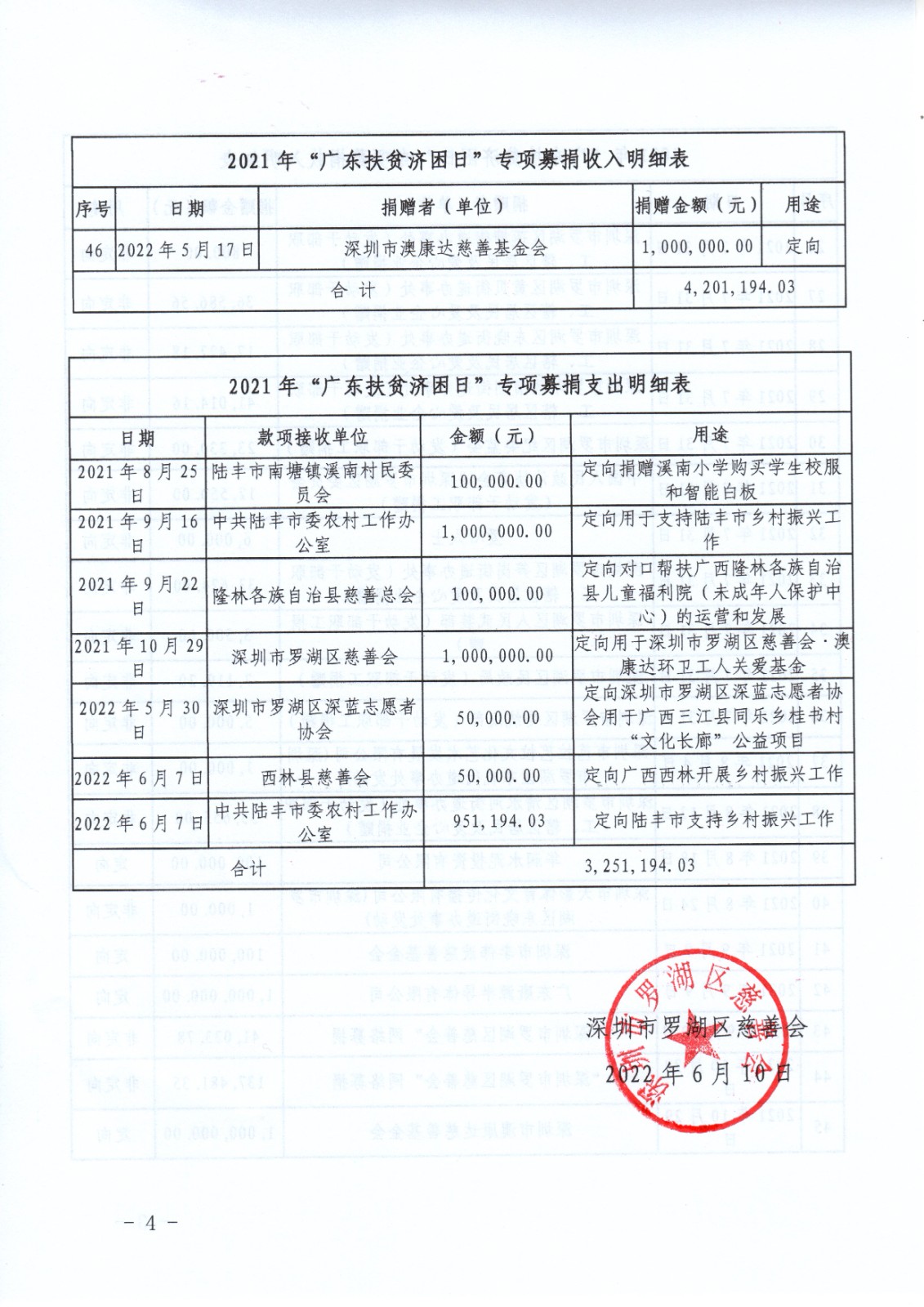 截至2022年6月10日,深圳市罗湖区慈善会共募集接收2021年“广东扶贫济困日”活动专项资金4201194.03元,支出3251194.03元,结余950000.00元。