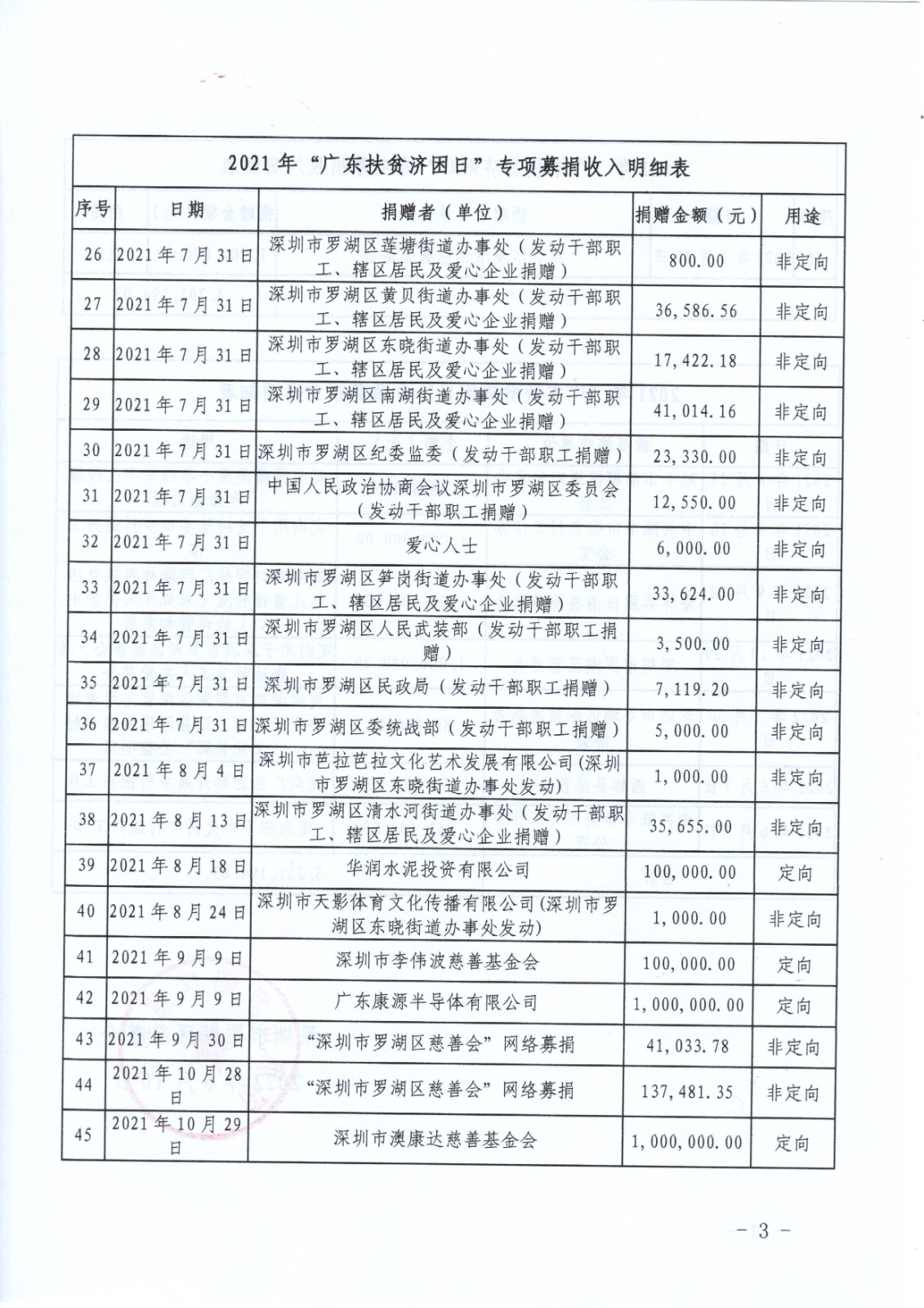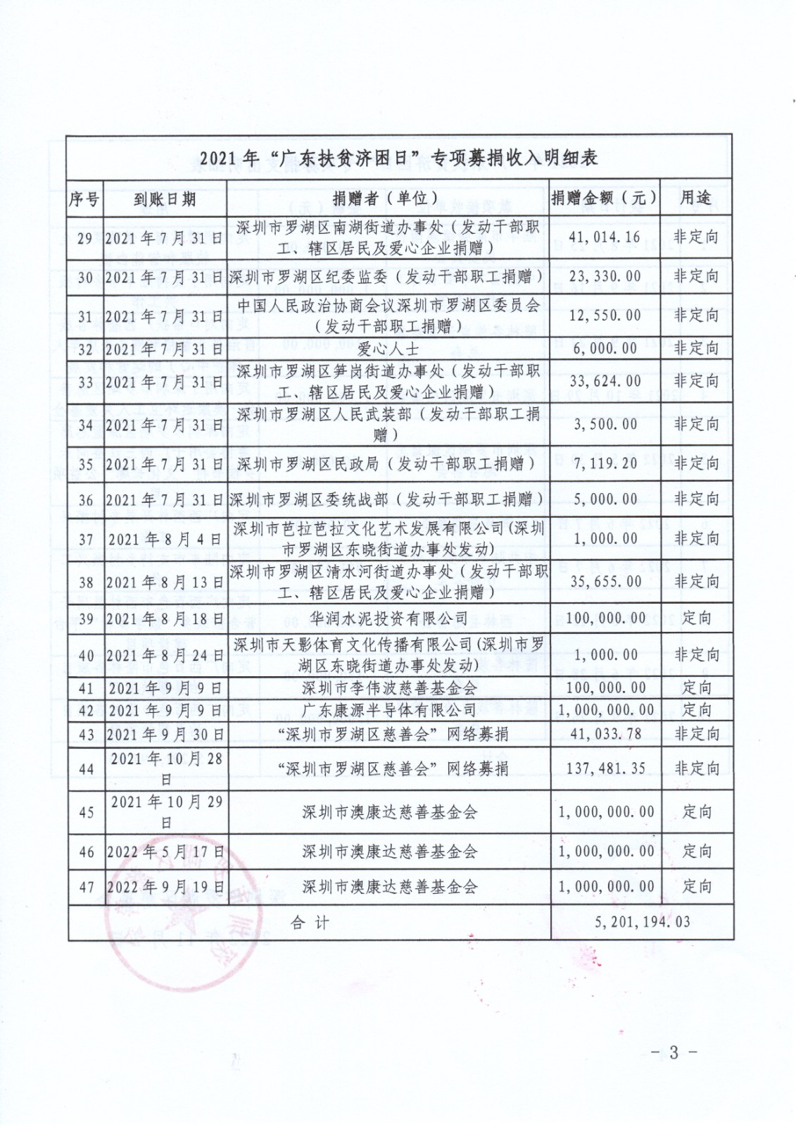 【结项进展】截至2022年11月3日,深圳市罗湖区慈善会共募集接收2021年“广东扶贫济困日”活动专项资金5201194.03元,支出5201194.03元,结余0元。此次募集的捐款,捐赠人指定用途的用于指定用途;无指定的由区对口办统筹用于助力罗湖区对口帮扶地区巩固拓展脱贫攻坚成果和开展乡村振兴。