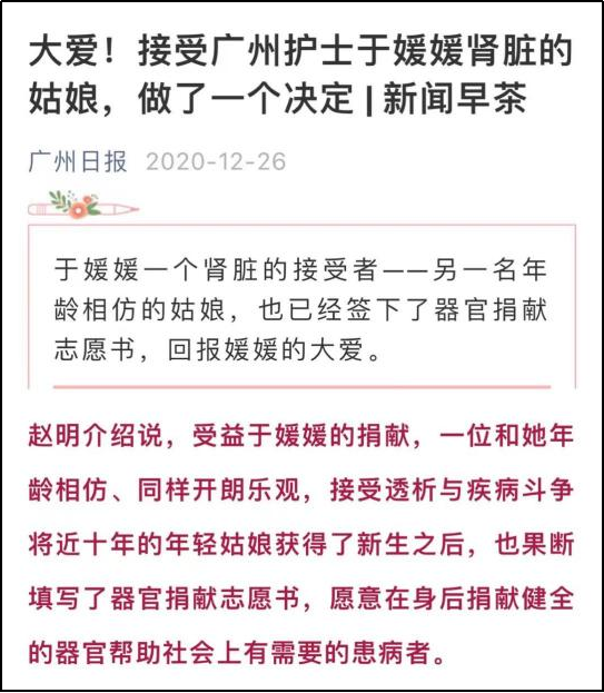 不幸的是媛媛在2020年被查出患有血管母细胞瘤,尽管她努力和病魔进行抗争,但最终没有迎来期望中的结果。40多天后,媛媛的生命永远定格在了23岁,但她把更多希望留在了人间,媛媛捐献的2个肾脏,使2位肾衰竭患者重获新生,其中一位病人为了这个珍贵的肾源,已经等待了7年。