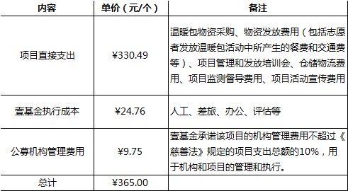 注:项目筹款起止时间为2019年12月至2020年12月,项目最低执行金额为365元,剩余善款将转移到壹基金温暖包上期项目。