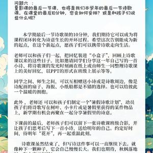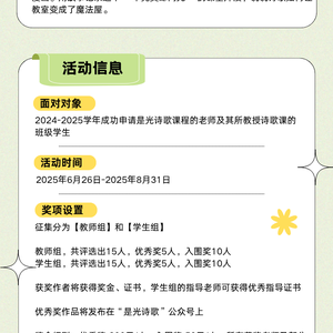 10. 6月26日,“我与诗歌”故事征集活动启动,本次征文的主题是“诗歌课上的'意外'瞬间"。征集活动面向本学年成功申请是光四季诗歌课程的老师及其所教授诗歌课的班级学生,将从2025年6月26日一直持续到2025年8月31日,期待老师们和学生们的积极参与。