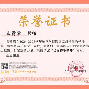 1. 7月2日-7日,项目部对2024-2025学年春季学期的诗歌课程完成情况进行了总结与复盘,同时为按时授课、认真反馈的是光教师制作并发放了“优秀诗歌教师”证书及结业证书,感谢各位是光教师在本学期和孩子们一起去感受诗歌课、带领孩子们去自由表达自己的情感,期待下学期我们可以继续发光发亮!