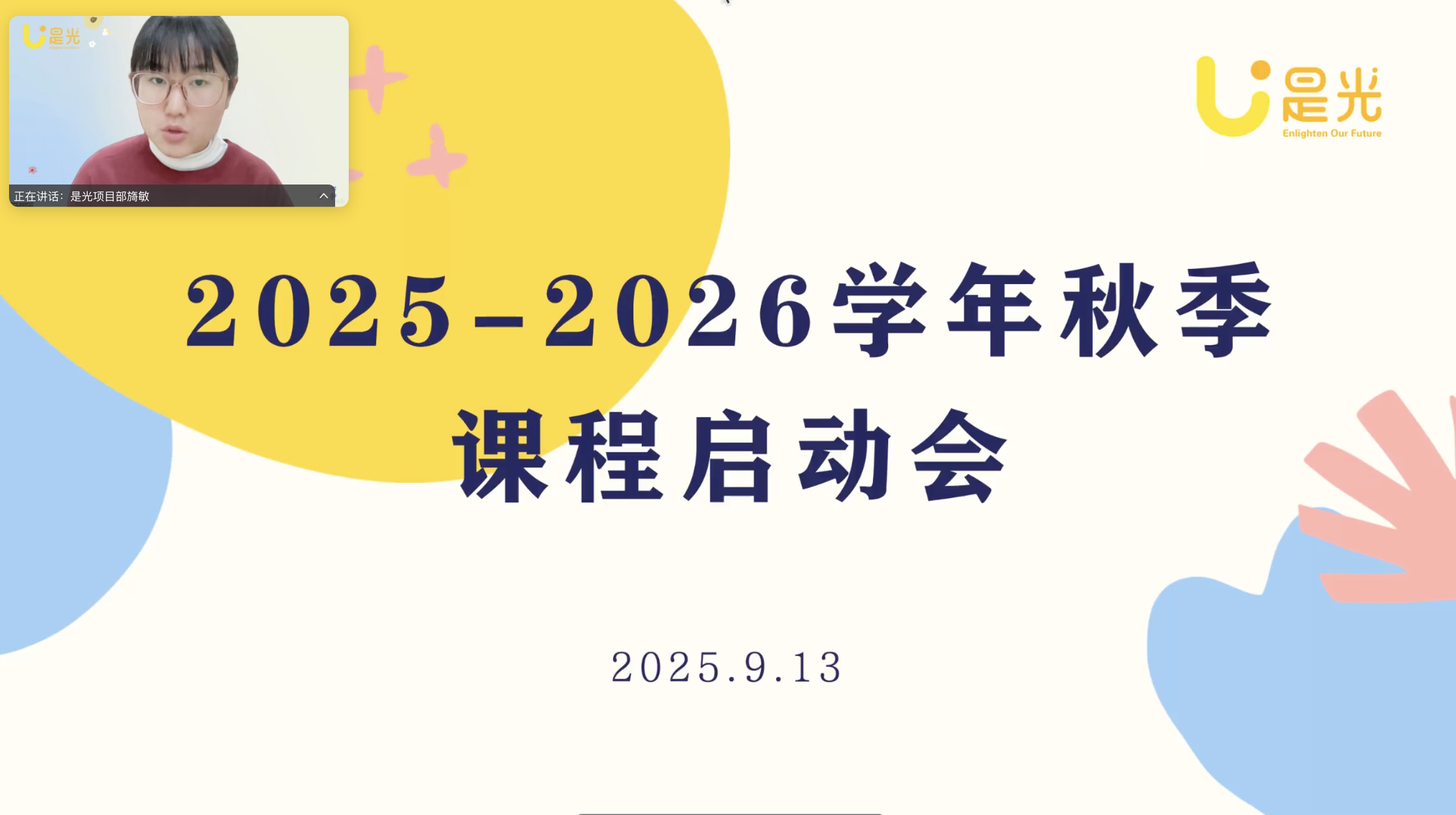 3. 9月13日,项目部在诗歌教师交流群开展了2025-2026学年秋季学期课程启动会,“是光”诗歌项目部旖敏为“是光”教师们详细介绍了机构的基本情况、““是光”诗歌”课程体系、授课方式及反馈要求、“是光”诗歌的教师激励体系、其他相关注意事项。直播期间,项目部全体成员与在线观看的“是光”教师们进行互动、答疑解惑。