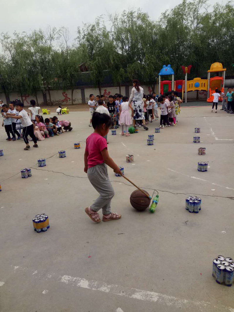 (孩子们用自制的易拉罐玩具做游戏)
