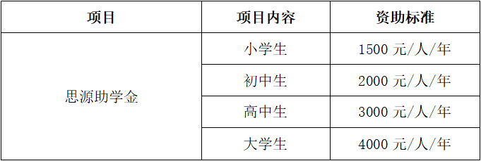 “思源助学金”公益项目以全国家庭贫困大中小学毕业生为资助对象。具体条件为:1、家庭贫困:家庭人均月收入低于(或刚达到)本地区城市居民最低生活保障,无力支持完成学业;孤儿及家庭遭受天灾人祸者在同等条件下优先;2、品学兼优:勤奋刻苦、上进好学、吃苦耐劳、成绩较好;或某专业特长较为突出的学生;3、家长和学生同意。