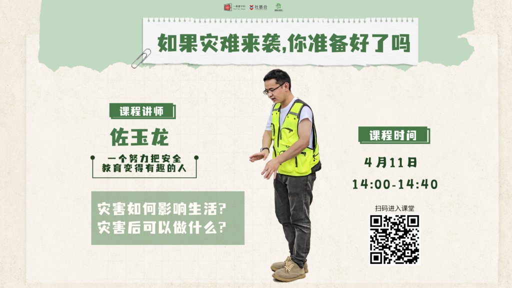 4月11日,如果灾害不幸来袭,你真的准备好了吗?经历过512地震的佐玉龙老师,目前在一家防灾减灾的机构工作,佐老师从不同视角让同学们学习灾害带给人类的影响,以及作为普通学生如何正确面对这些影响。