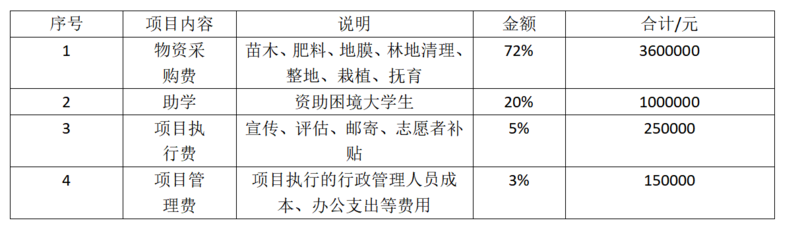 项目筹款目标5,000,000元,项目计划在全国范围内开展植树造林、和资助困境大学生项目,详细预算如下: