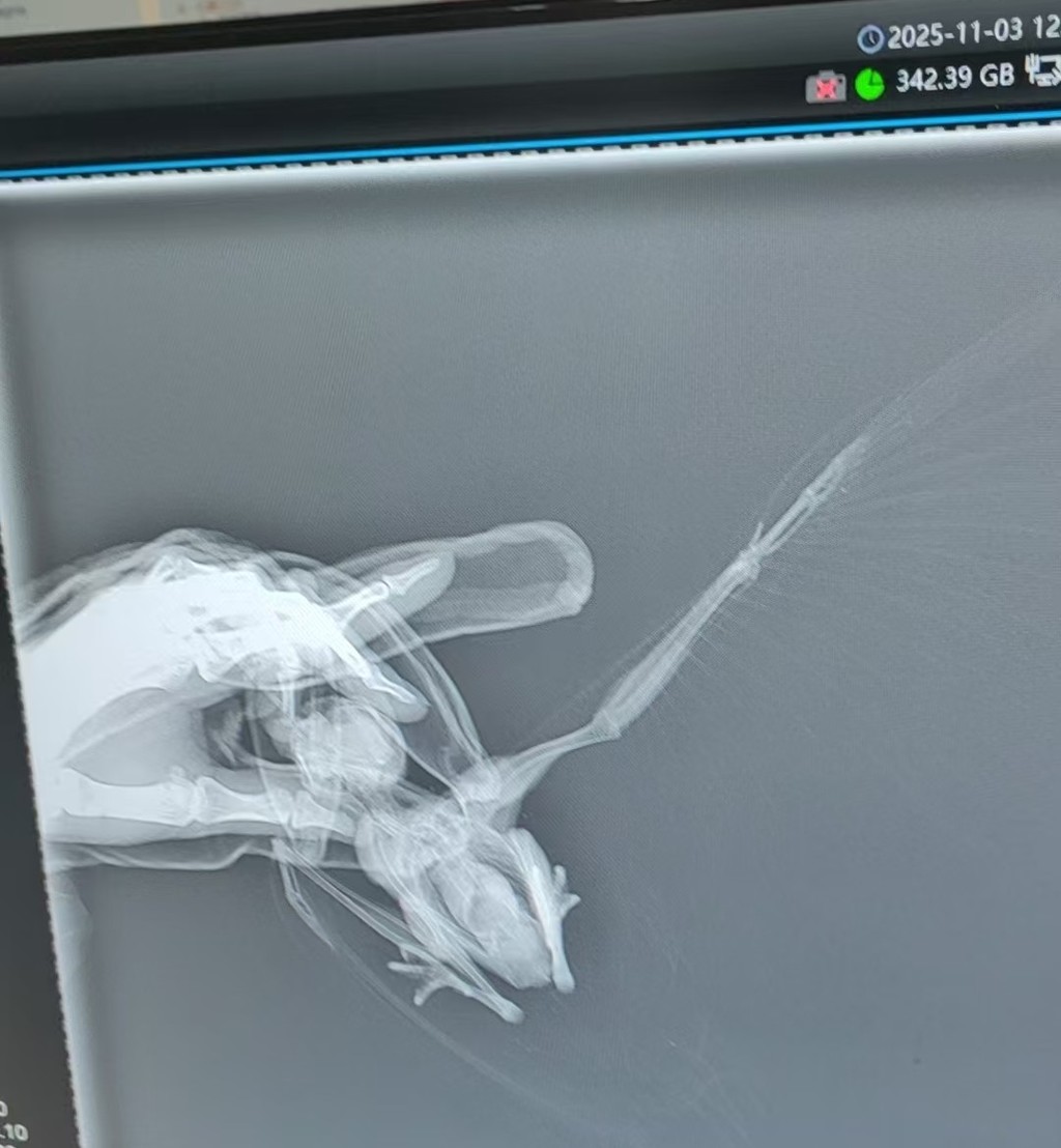 图 1 2025年11月3日,大理市公安局北区派出所将一只红角鸮送至中心。工作人员第一时间对其进行全面体检,X光片检查结果显示该个体无骨折、体内异物等明显异常 |
