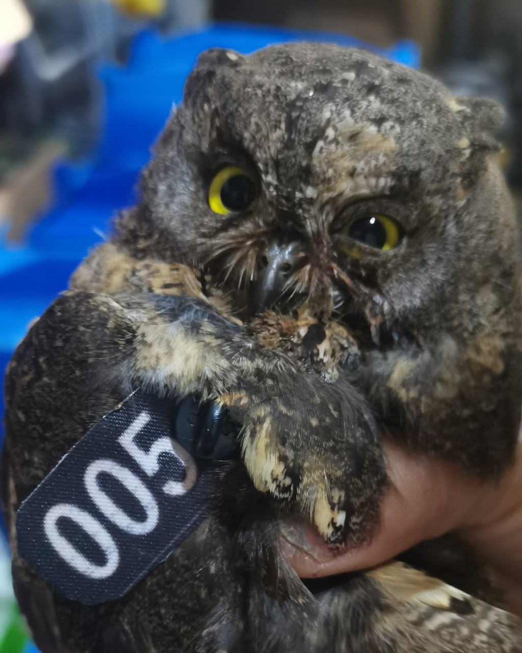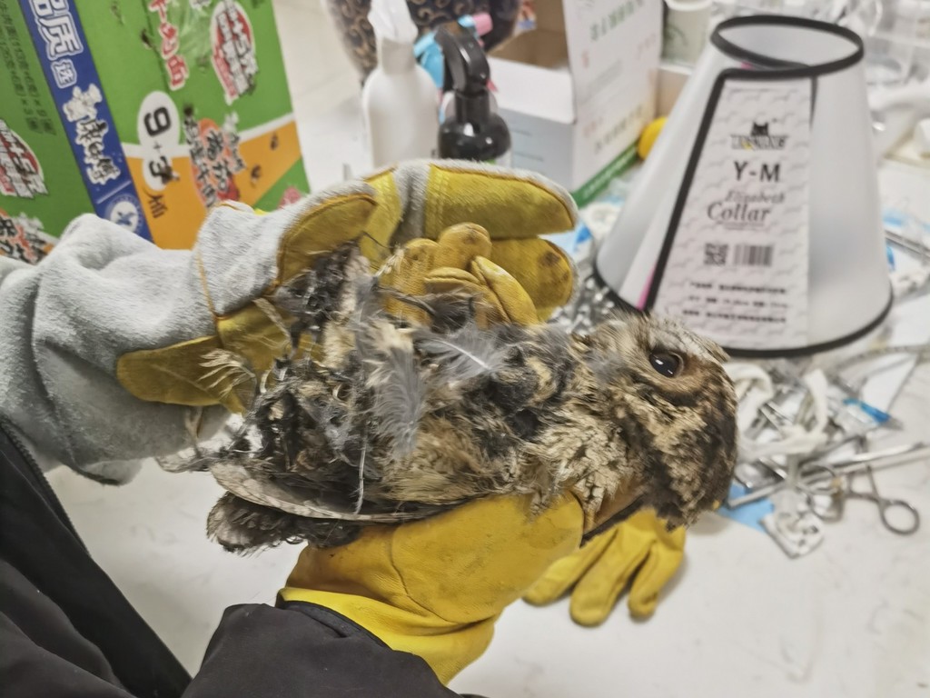 图 6 2025年11月25日,大理市林业和草原局移交一只领角鸮。经检查,该个体体表粘有大量粘鼠胶,羽毛粘连严重 |