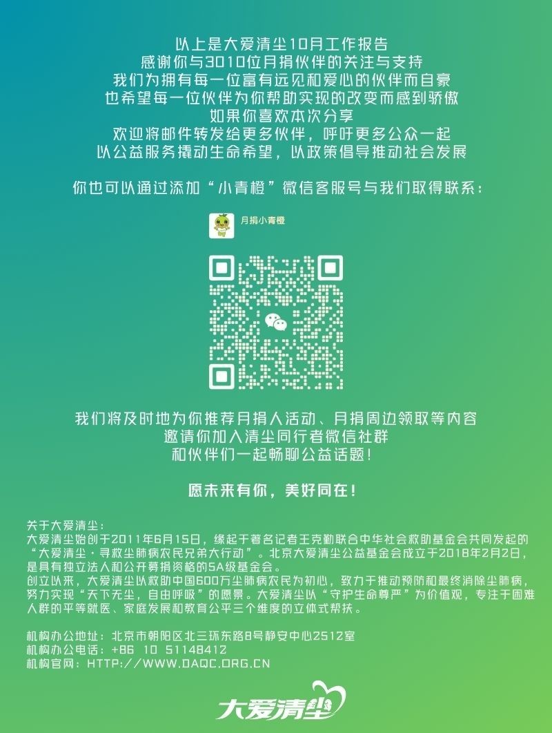 亲爱的清尘同行者伙伴[#姓名#]: 展信佳! 10月,大爱清尘公共政策研究院正式启动2025年白皮书调研。今年,我们将重点放在人造石英石加工行业——这一正在快速扩张、同时伴随高粉尘暴露与年轻化患病趋势的新型高危领域。为全面呈现行业风险,我们前往山西临汾、宁夏银川、贵州贵阳、贵定等地,开展作业环境记录、粉尘监测与工人问卷调查,在加工厂、入户安装现场与医院病房间往返,希望以全链条方式呈现矽肺新发的行业现状。