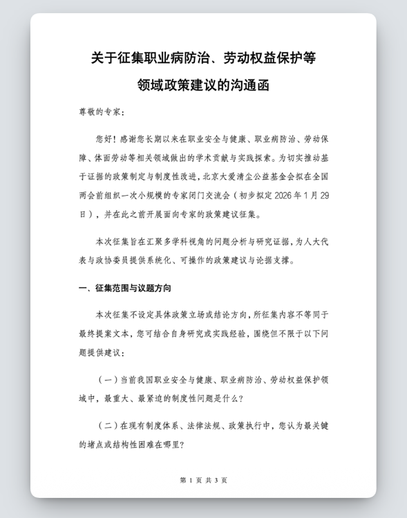 亲爱的清尘同行者伙伴: 展信佳! 2026年1月29日,我们在北京顺利举办第十四届推动解决尘肺病农民问题交流会,邀请来自全国各地的全国人大代表、职业病防治专家、公共卫生与政策研究者、法律界人士与社会组织代表齐聚一堂,围绕一个共同的目标——在“十五五”开局之年,推动尘肺病防治的制度性突破。 十四年来,我们始终相信:个体的救助无法替代制度的改变,而制度的改变,始于一次次坦诚的对话与理性的建言。 会前,我们面向职业病防治链条上的专家学者、卫生行政官员广泛征集建议案,涵盖职业健康顶层设计、源头预防、诊断鉴定、社会保障等重要议题。在此基础上,我们撰写形成了8条建议案草案,为两会提交做好了充分准备。 |
