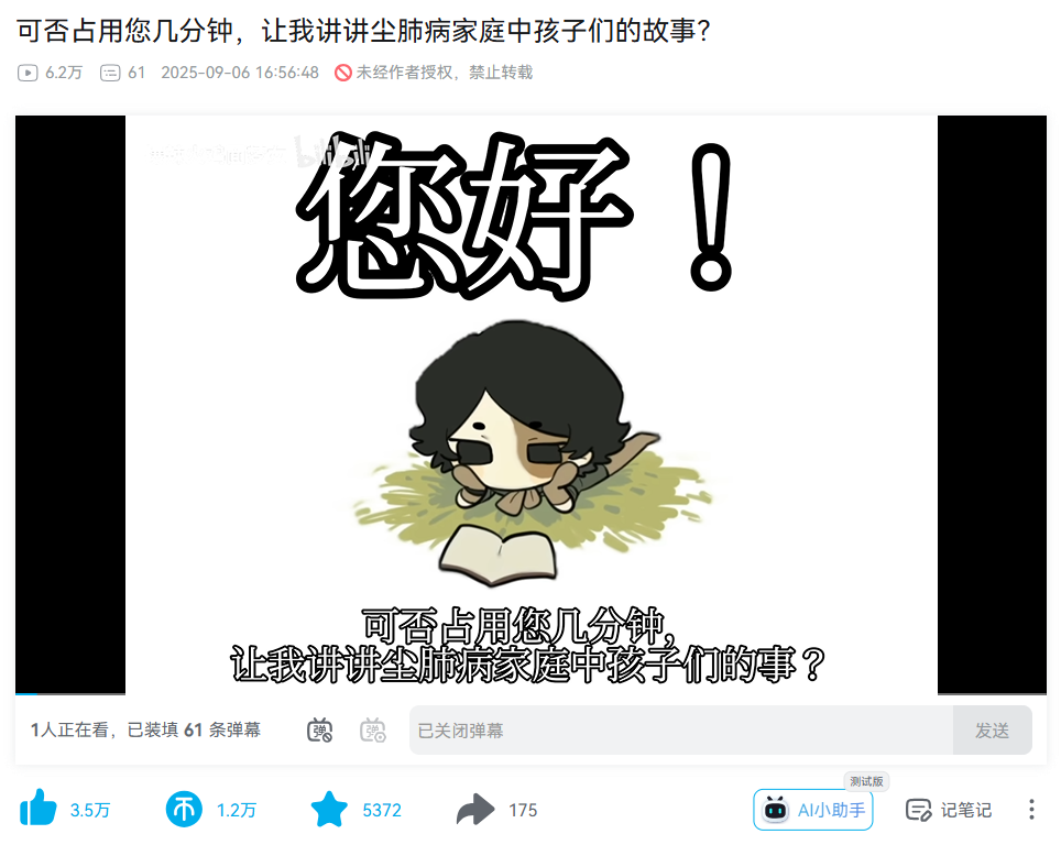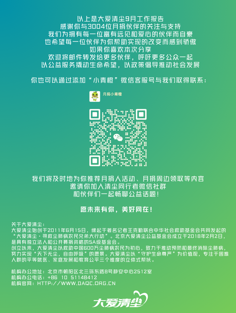 亲爱的清尘同行者伙伴: 展信佳! 9月,是因爱而生的月份。9月5日“中华慈善日”的到来,让社会的目光再次汇聚于“公益”这一温暖的概念。对于大爱清尘而言,这不仅是一个纪念的日子,更是一场贯穿整月的行动号召。线上线下的善意同时奔涌——从辽宁葫芦岛的实地探访,到全国64个点位的小红花义卖;从康复课堂的云端开讲,到”青少年肺健康科普进校园“活动在新学年的再度启程——每一场行动都让公益的力量以更全面、更贴近的方式触达需要的人。不同领域的伙伴与志愿者和公众一起,在真实的互动中验证公益的价值,在共情与共行中汇聚希望。这个9月,我们以行动书写慈善,以连接延展温度,让“久久”的善意持续发亮。 9月到来之际,7位来自不同领域、不同身份、不同年龄的伙伴,带着对尘肺病议题的共同关注和对公益的共同热忱相聚辽宁葫芦岛,一起踏上了一段“求真”与“求解”的尘肺农民家庭探访之旅,并在此过程中通过亲身验证大爱清尘的公益项目成效,对公益的真实性、有效性、数字化实践等方面开展调研。 |