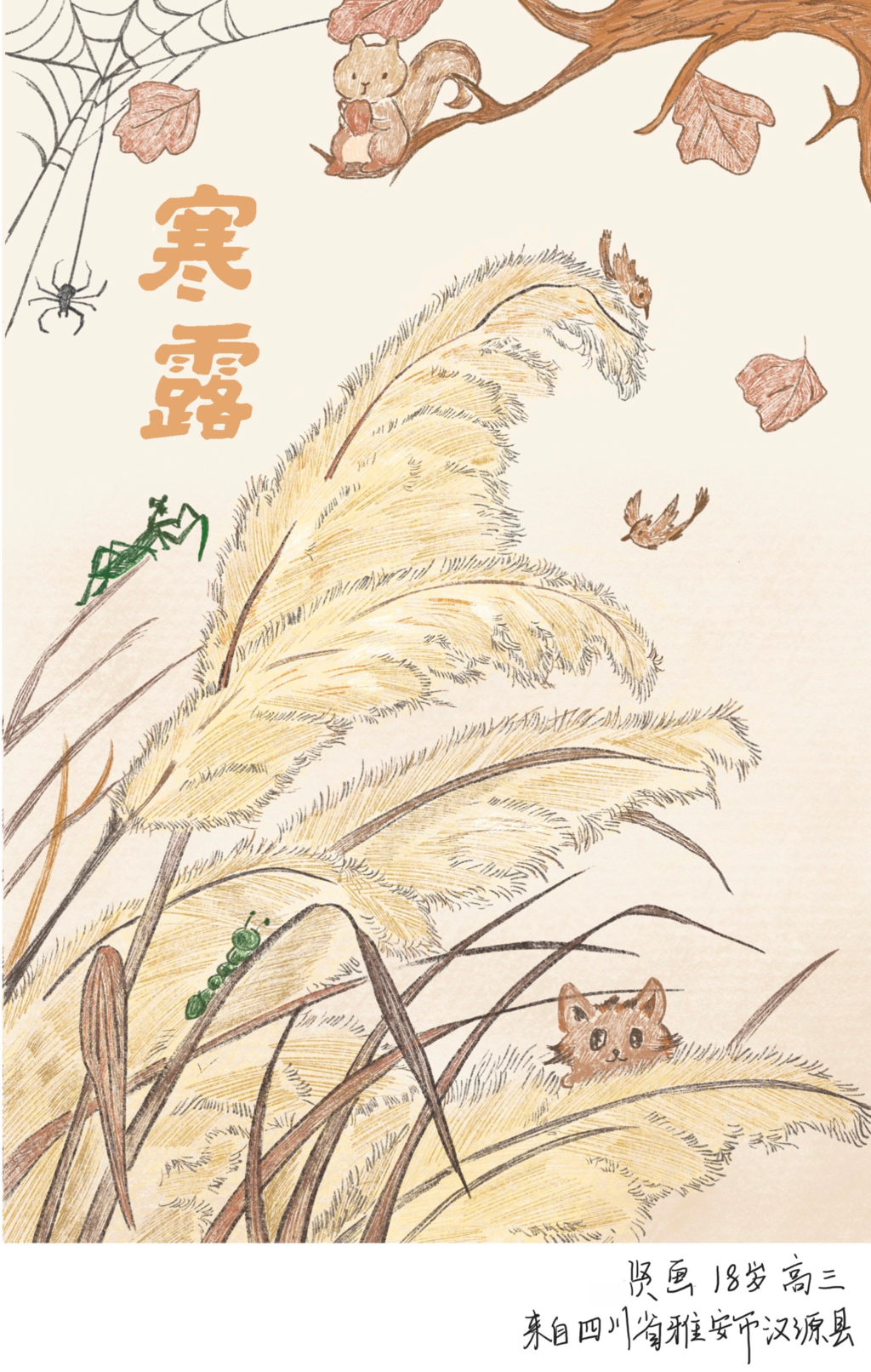 Lyra与小贤的缘分,始于大爱清尘邀请尘肺家庭孩子们一起创作的二十四节气主题画作。她看到小贤的《寒露》时,被画中的纯粹和清澈打动,于是决定以匿名的方式持续资助小贤上大学期间的生活费。