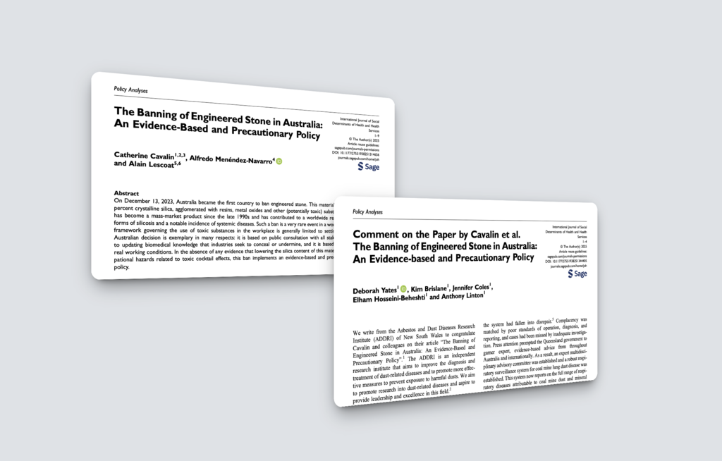 本月,研究院继续将目光投向全球,持续编译并引入国际权威研究,以资国内借鉴。近期,研究院重点关注并编译了针对澳大利亚人造石禁令的深度评论及澳大利亚石棉与粉尘疾病研究所(ADDRI)的回应文章。