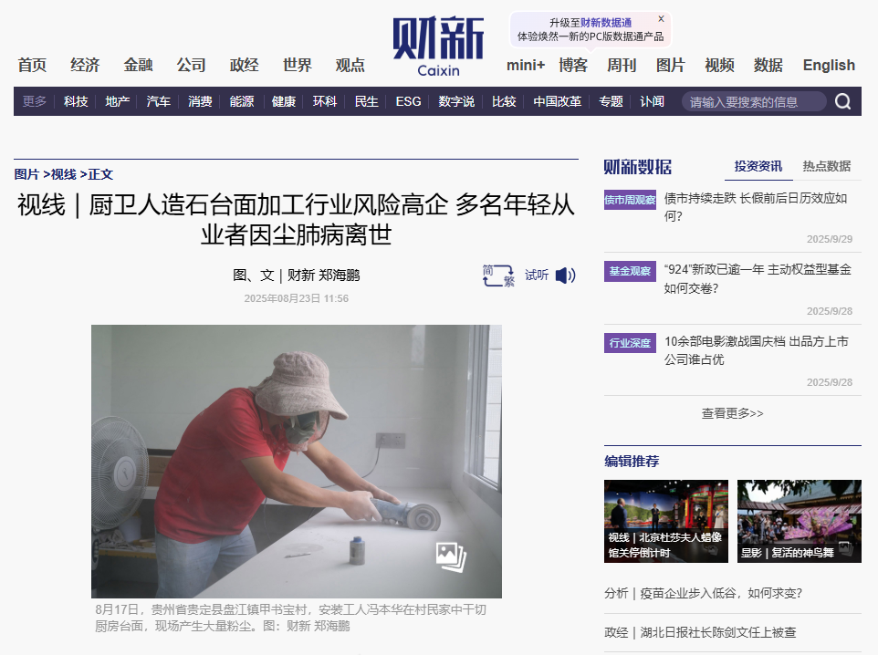 8月23日,财新周刊发布深度报道《厨卫人造石台面加工行业风险高企 多名年轻从业者因尘肺病离世》,将目光聚焦于厨房浴室常用的人造石英石背后的粉尘危害。记者跟随大爱清尘在贵州贵定县走访时,见到两位已是尘肺叁期的“90后”患者。因完全丧失劳动能力,他们仅能依靠低保维持生计以及为数不多的收入维持生计。更令人忧心的是,报道中接触的数名仍在从事台面加工的工人,虽已出现尘肺症状,却因生计所迫不得不继续留守在这个行业。