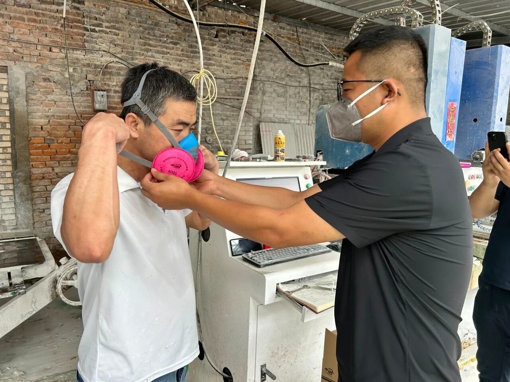 此次调研,爱心企业浙江南核安全科技有限公司的伙伴也一同来到一线工作现场,为工人们发放了防尘面罩和配套滤芯,并指导他们正确佩戴,提醒他们注意个人防护。