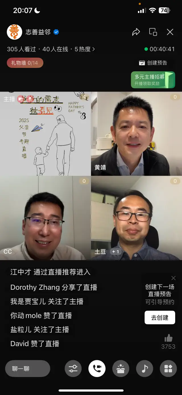 2025年1~6月“爸爸村庄”共开展:6次爸爸早餐会(其中3次线上、3次线下),3次融合活动,1次志愿者赋能,直接受益爸爸54人次,直接受益家属53人次,影响了志愿者5人,线上观看3011人次; 2025年1月~6月“爸爸村庄”项目募集善款97,700.00元,服务收入199.50元支出善款65,028.43元。