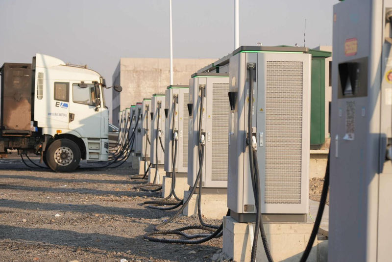 图:正在港口周边充电站补能的电动重卡