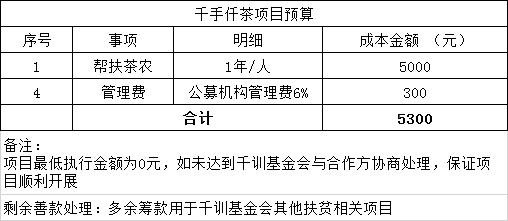 发起成立《千手仟茶乡村振兴公益基金》的目的就是希望“公益牵手”,汇聚各界爱心人士的力量,用公益流量支持国家乡村振兴计划,发展乡村特色产业。