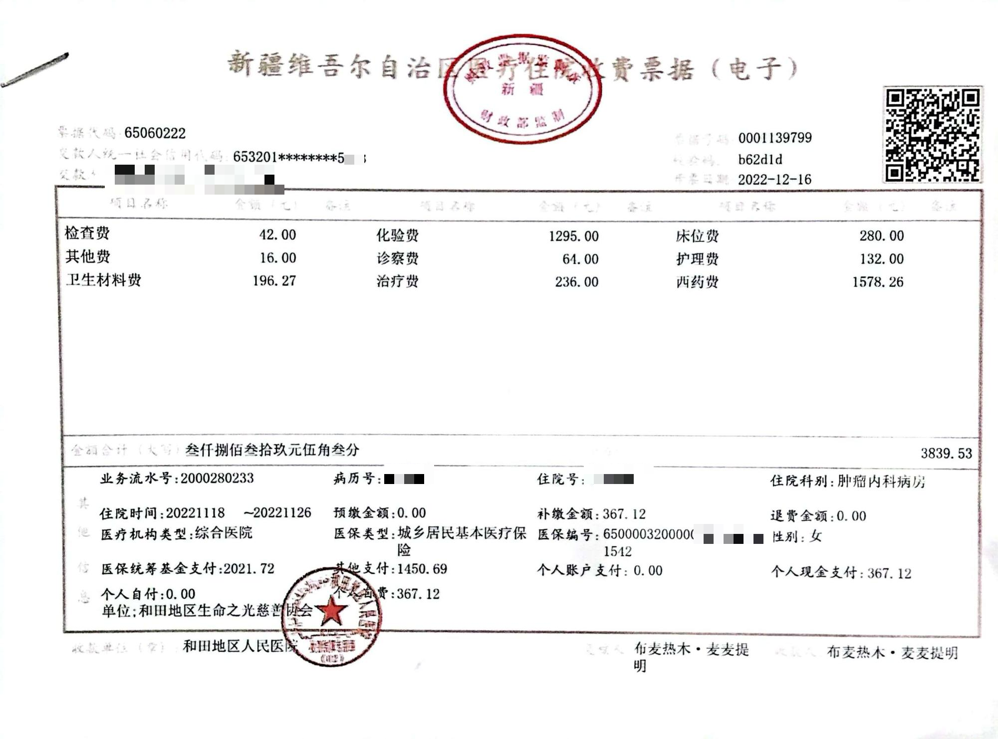 热孜宛古丽·肉孜托乎提于2022年11月在新疆和田地区人民医院(西院区)接受治疗,经治疗病情好转,目前患者已经出院在家休养。热孜宛古丽·肉孜托乎提治疗期间协会分三次次共计转款15852.83元用于其治疗费用。