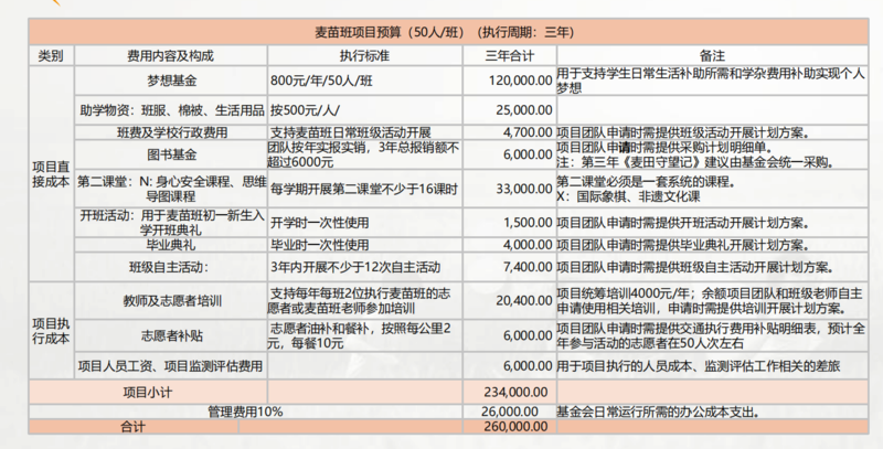 预计筹集1个麦苗班,单个麦苗班的预算是26万元。