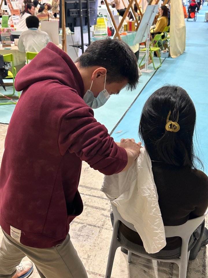 3月10日至12日,视障按摩师在现场提供正念按摩体验,在喧嚣的展会中,为往来人群带来片刻安静与放松。