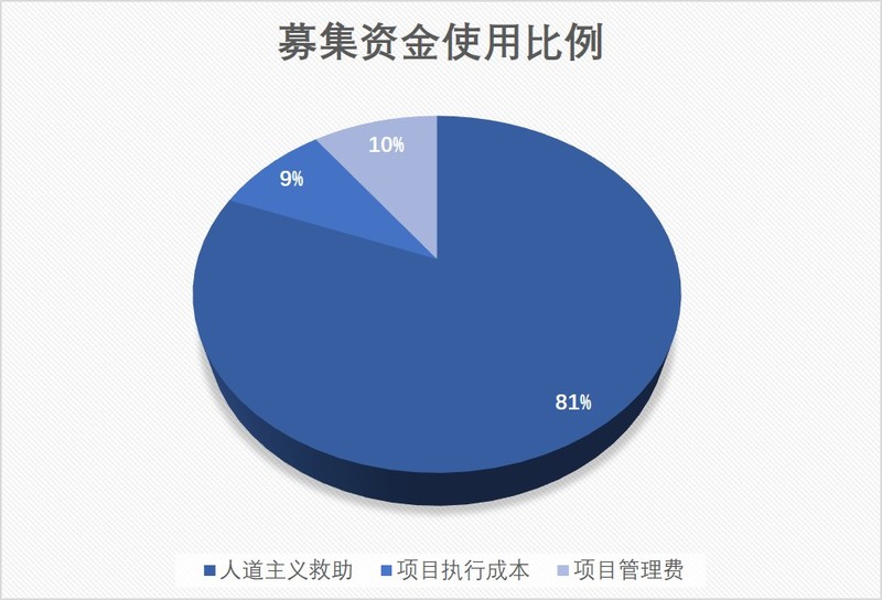 本项目为长期援助项目,将为符合项目救助条件的受助人提供人道主义救助金至其年满18周岁。其中募集资金的81%用于向受助对象发放人道主义救助金;9%为项目执行成本;10%为项目管理费。
