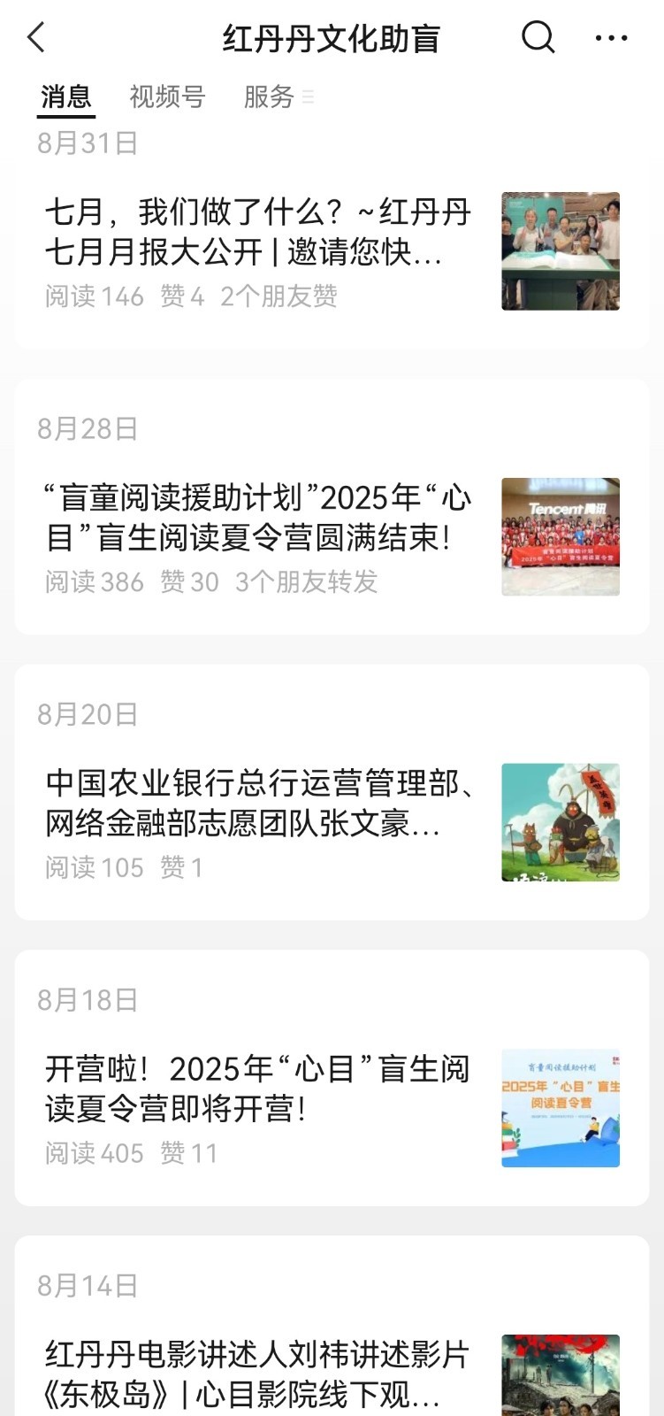 “红丹丹文化助盲”微信视频号推送短视频15个,浏览量17539次。