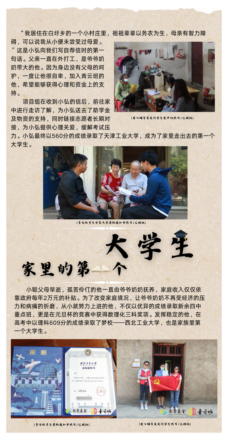 11月,青云班项目组联合中改集团开展了入户走访活动。此次走访聚焦2名青云班学子。在小李同学家是,小李同学带着我们参观满墙“优秀学生”“优秀作文”的奖状很自豪地说道:“我对语文和英语很感兴趣,以至于我在这两门功课上也相对于其他几门科目更加轻松。”对于聊到薄弱科目—数学和物理时,他显得很无奈:“初中我的数学和物理很轻松的学习就能考的很好,但是高中的时候我怎么花了心思去学,总是感觉有心无力。”中改集团的志愿者和小李促膝长谈了一番,告诉他每个人都有自己擅长和不擅长的事情,接受自己的不完美并不是一件坏事。