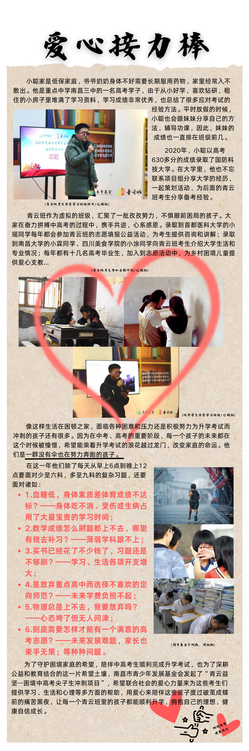 临近新学期,项目组收到了江西师范大学附属中学9名困境高考学子的助学申请表并在爱心公益平台发布了“联合探访活动”。