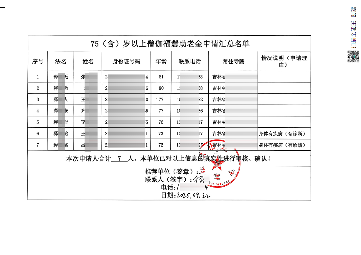 助老金公示:根据吉林省佛教协会提交的申请材料,经项目组审核,计划为7位法师发放助老金。