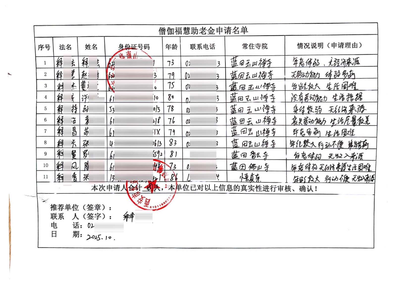 助老金公示:根据西安市长安区终南山佛协、蓝田县玉山寺、香云寺、佛山寺、悟真寺提交的申请材料,经项目组审核,计划为11位法师发放助老金。