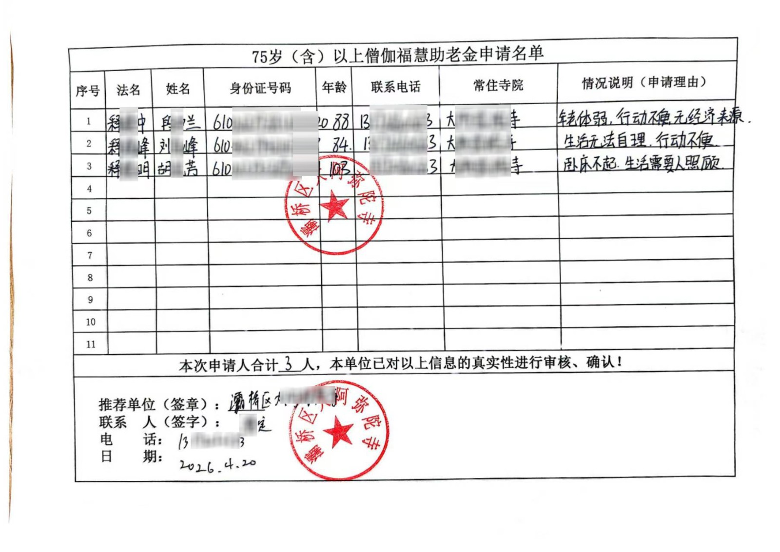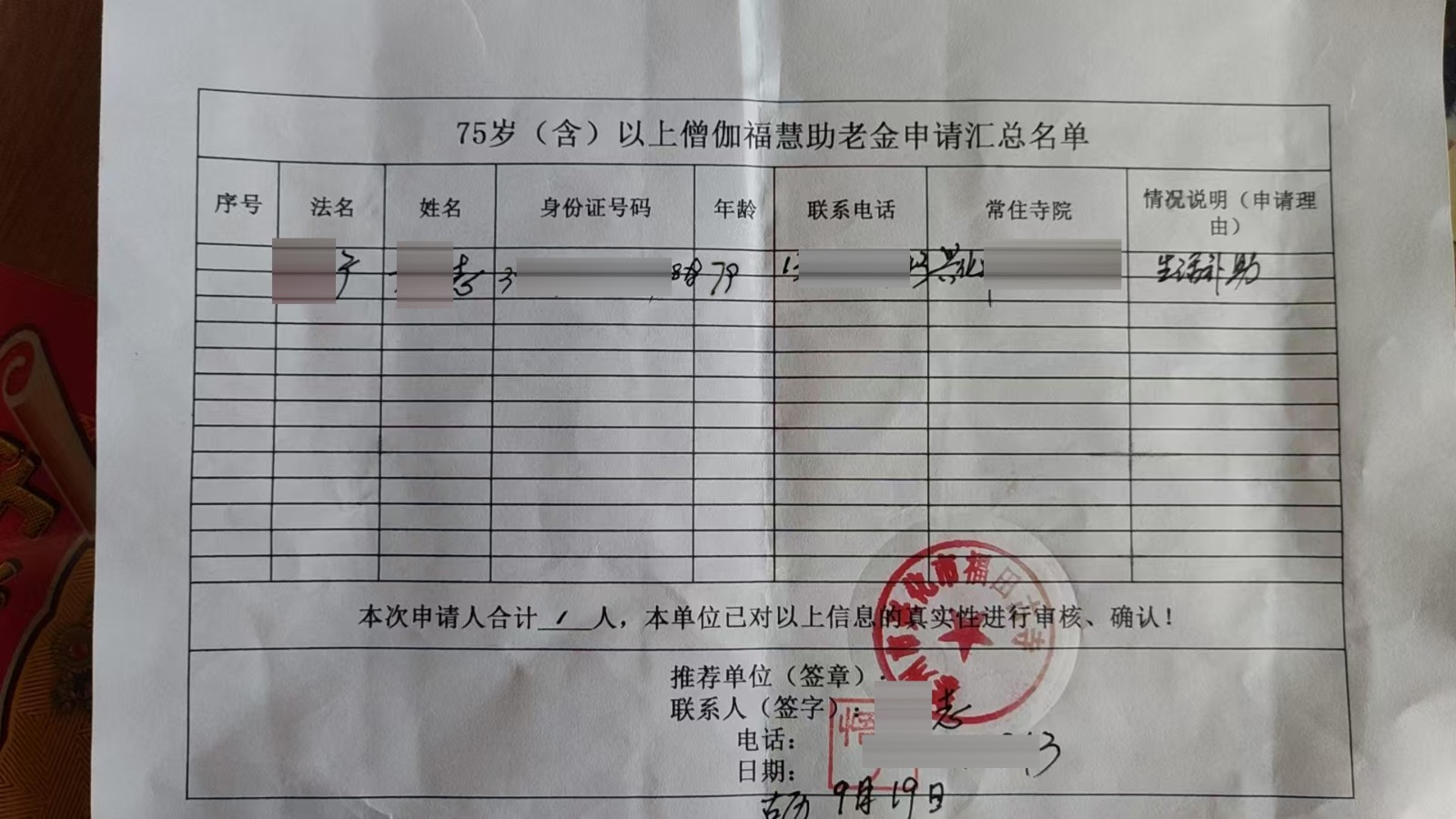 法师年迈,生活行动多为不便,故申请福慧助老金