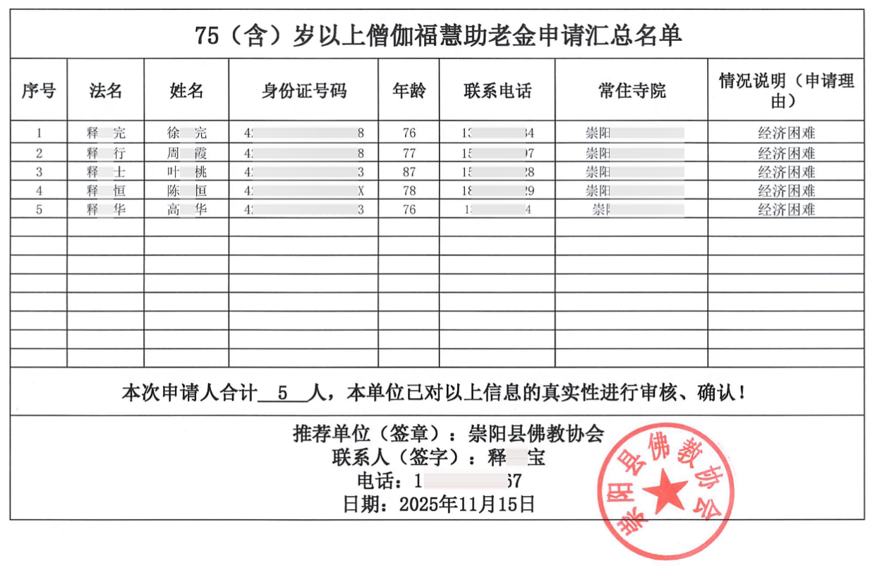 助老金公示:根据崇阳县大觉禅寺、远陂寺提交的助老金申请材料,经项目组审核,计划为5位法师发放助老金。