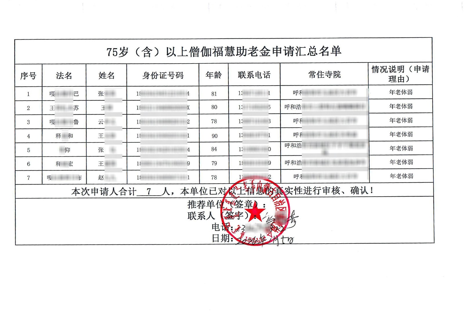 助老金公示:根据内蒙古呼和浩特提交的助老金申请材料,经项目组审核,计划为7位法师发放助老金。