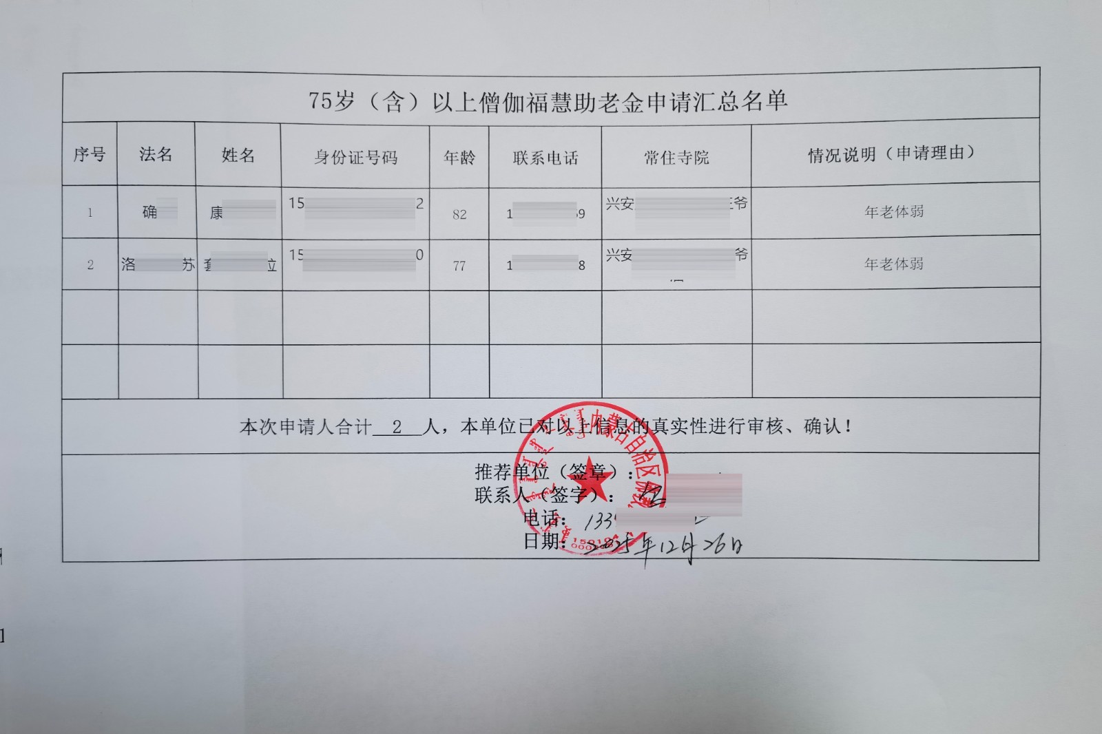 助老金公示:根据内蒙古兴安盟提交的助老金申请材料,经项目组审核,计划为2位法师发放助老金。