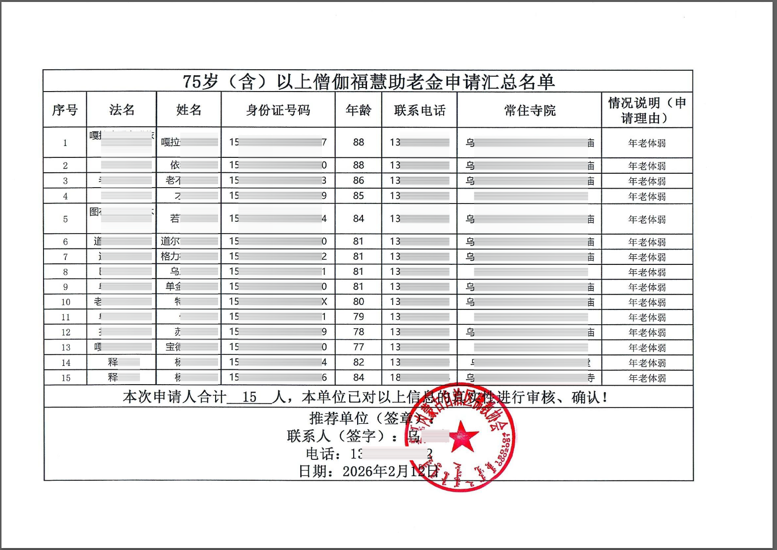 助老金公示:根据内蒙古乌兰察布提交的助老金申请材料,经项目组审核,计划为15位法师发放助老金。