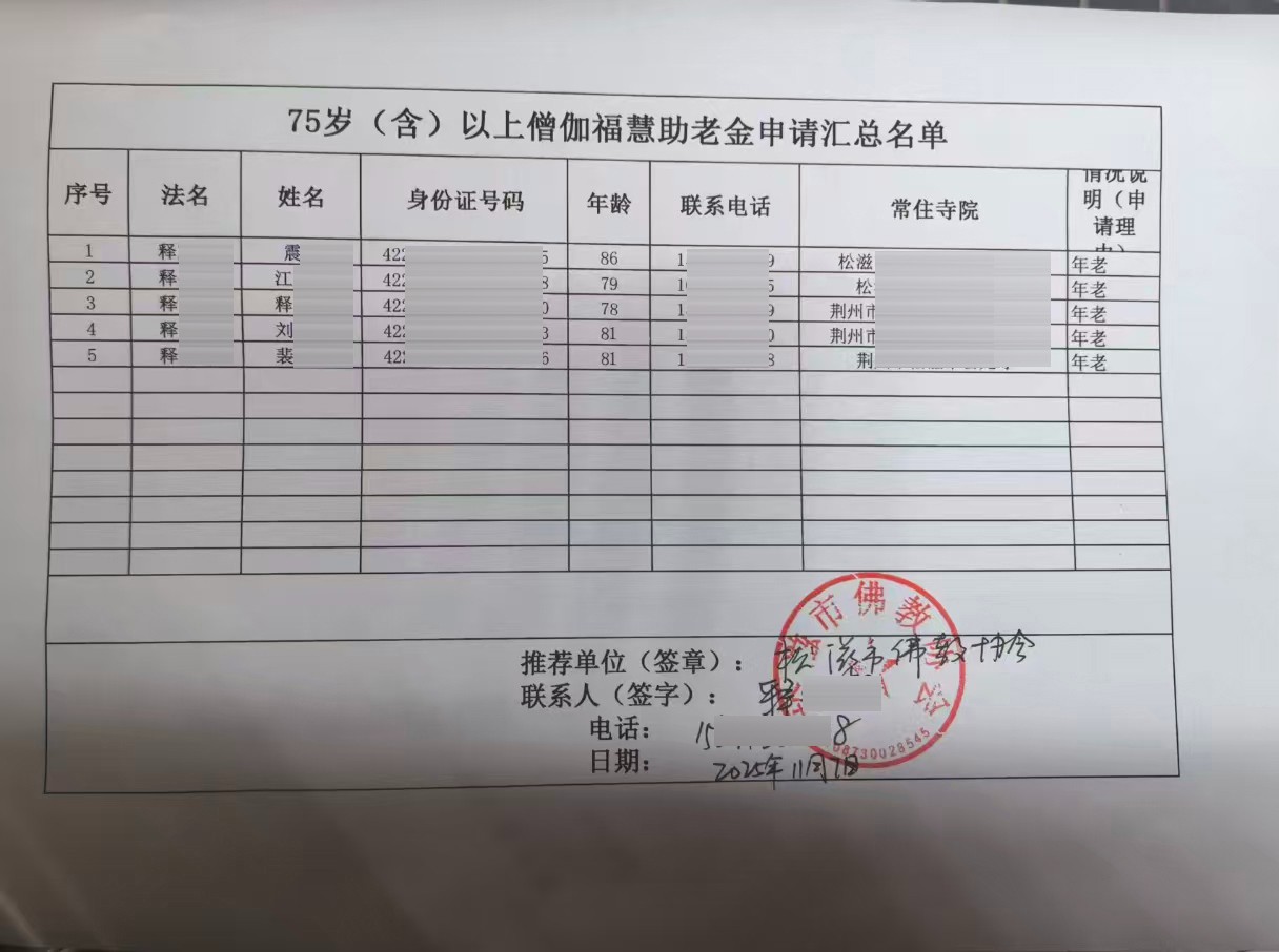 助老金公示:根据松滋市佛协提交的助老金申请材料,经项目组审核,计划为5位法师发放助老金。