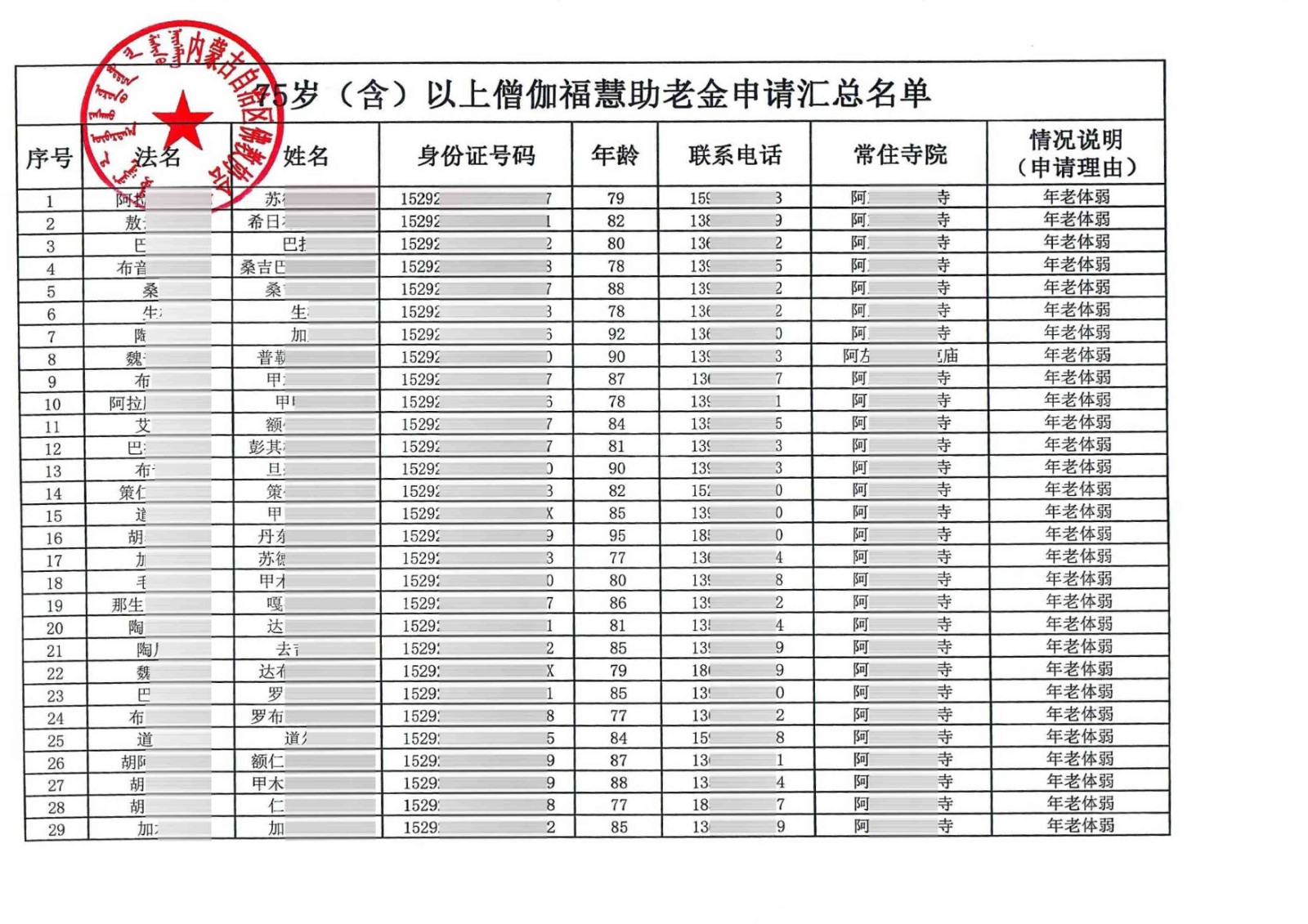 助老金公示:根据内蒙古阿拉善提交的助老金申请材料,经项目组审核,计划为85位法师发放助老金。