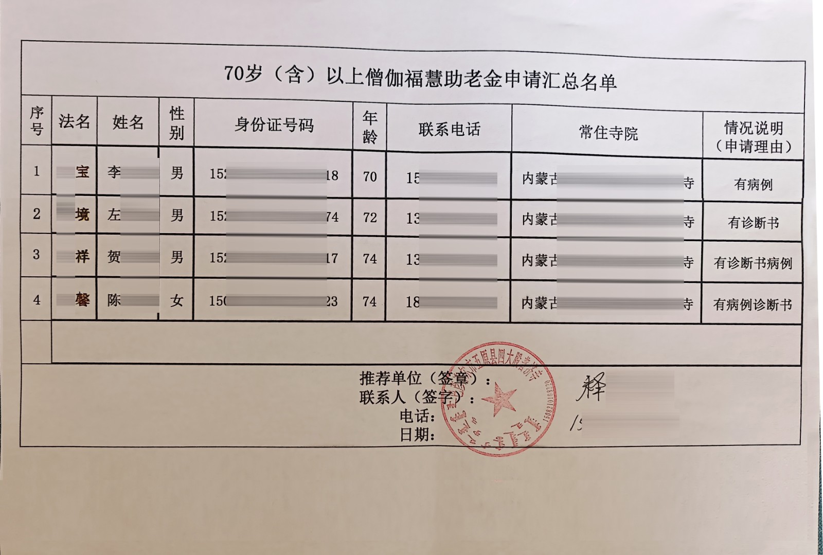 助老金公示:根据内蒙古巴彦淖尔普济寺提交的助老金申请材料,经项目组审核,计划为13位法师发放助老金。