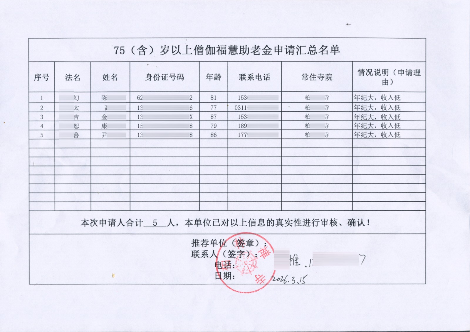 助老金公示:根据河北省石家庄柏林禅寺提交的助老金申请材料,经项目组审核,计划为5位法师发放助老金。
