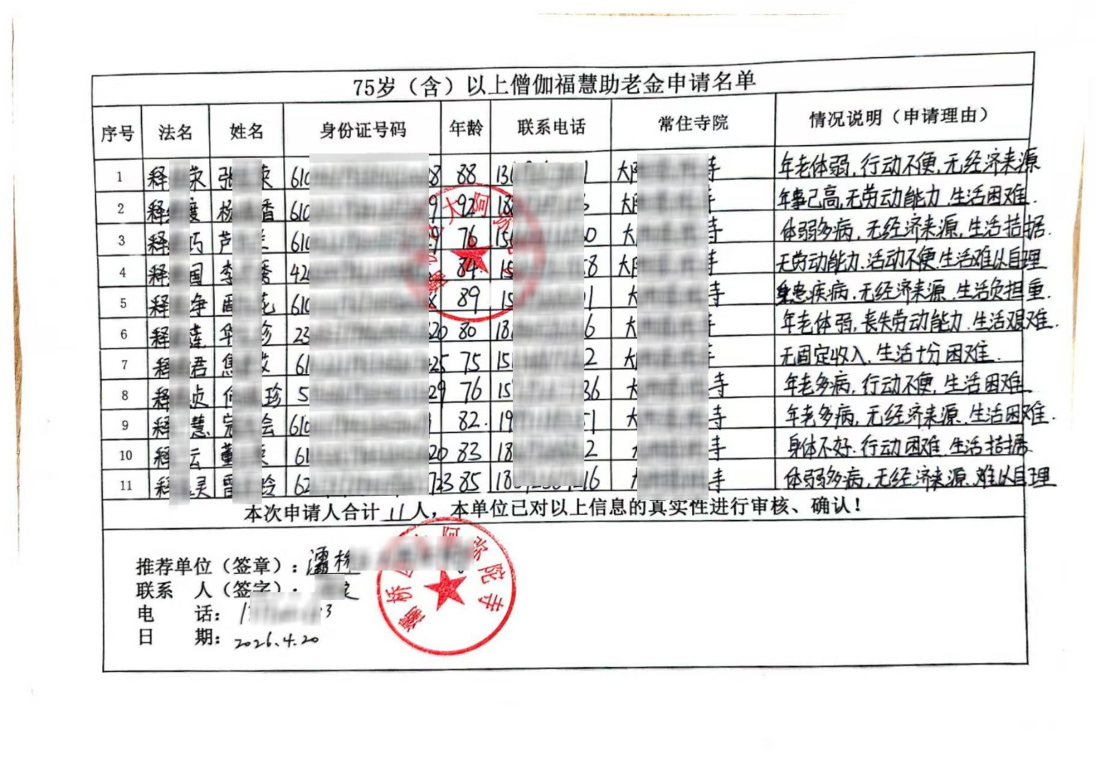 助老金公示:根据圆融禅寺提交的助老金申请材料,经项目组审核,计划为5位法师发放助老金。