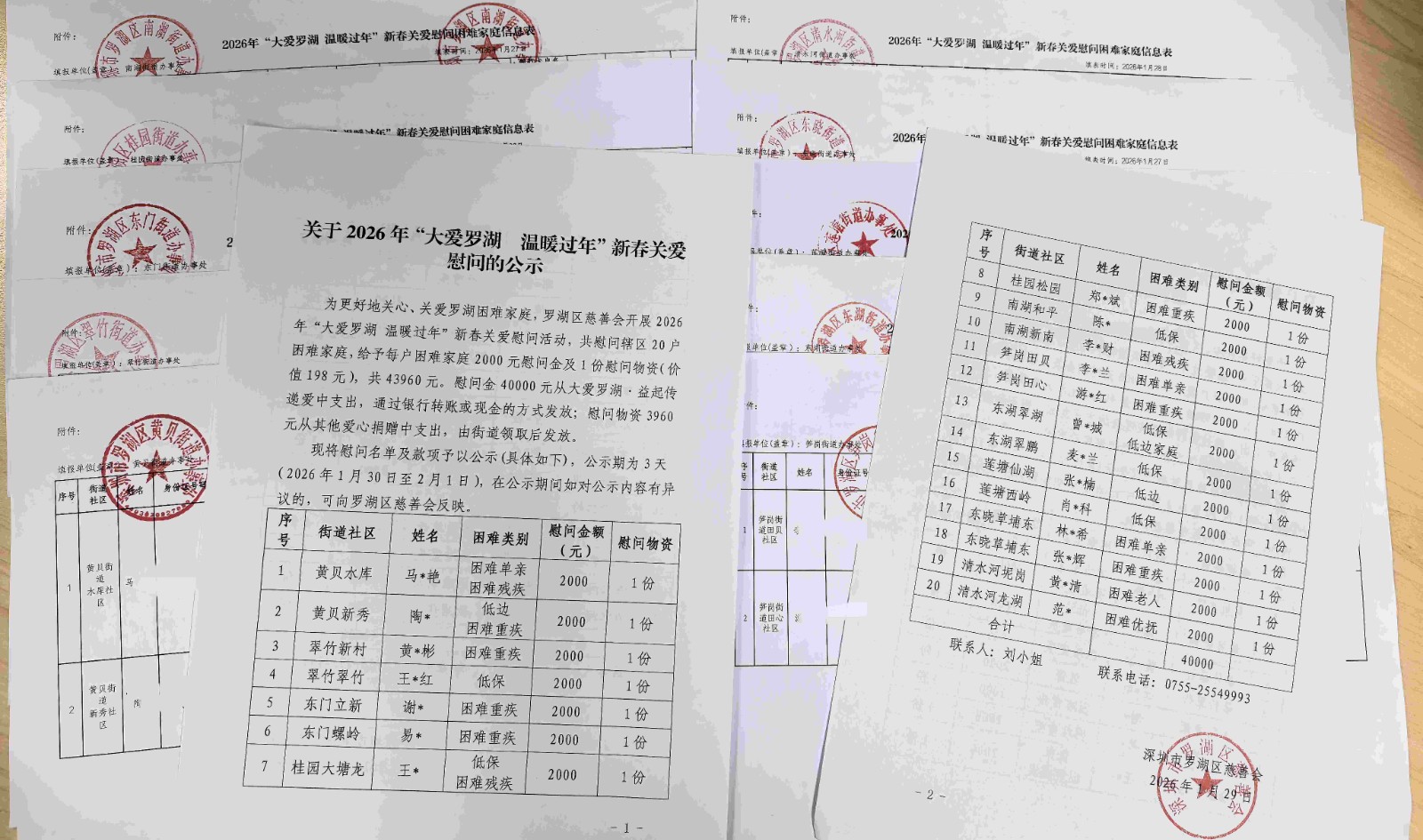 项目自2025年8月27日至2026年2月10日,累计募集善款80156元(线下捐赠收入共计70171.4元,通过互联网平台捐赠收入共计9984.6元)。第1期公示结余善款3778955.19元。本公示期间累计支出40000元,用于“大爱罗湖”慈善帮扶计划(2026年“大爱罗湖 温暖过年”困难家庭新春关爱慰问活动,给予20户困难家庭每户2000元慰问金,共计4万元)。现项目结余3586245.19元(支出及结余含第1期结转资金)。