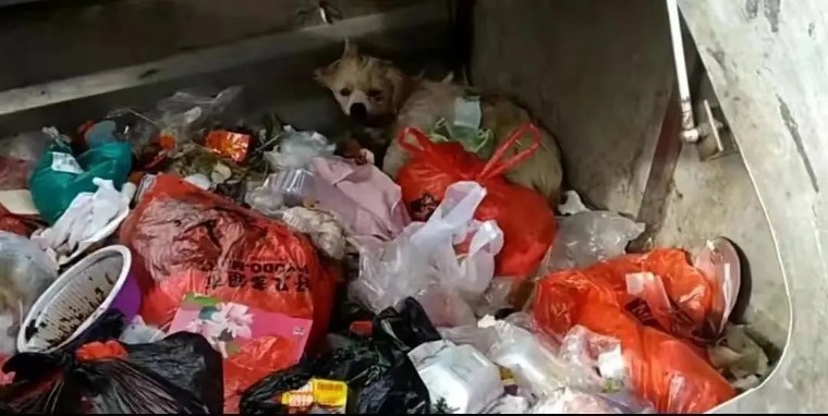 救助垃圾桶被垃圾掩埋虚弱的狗狗