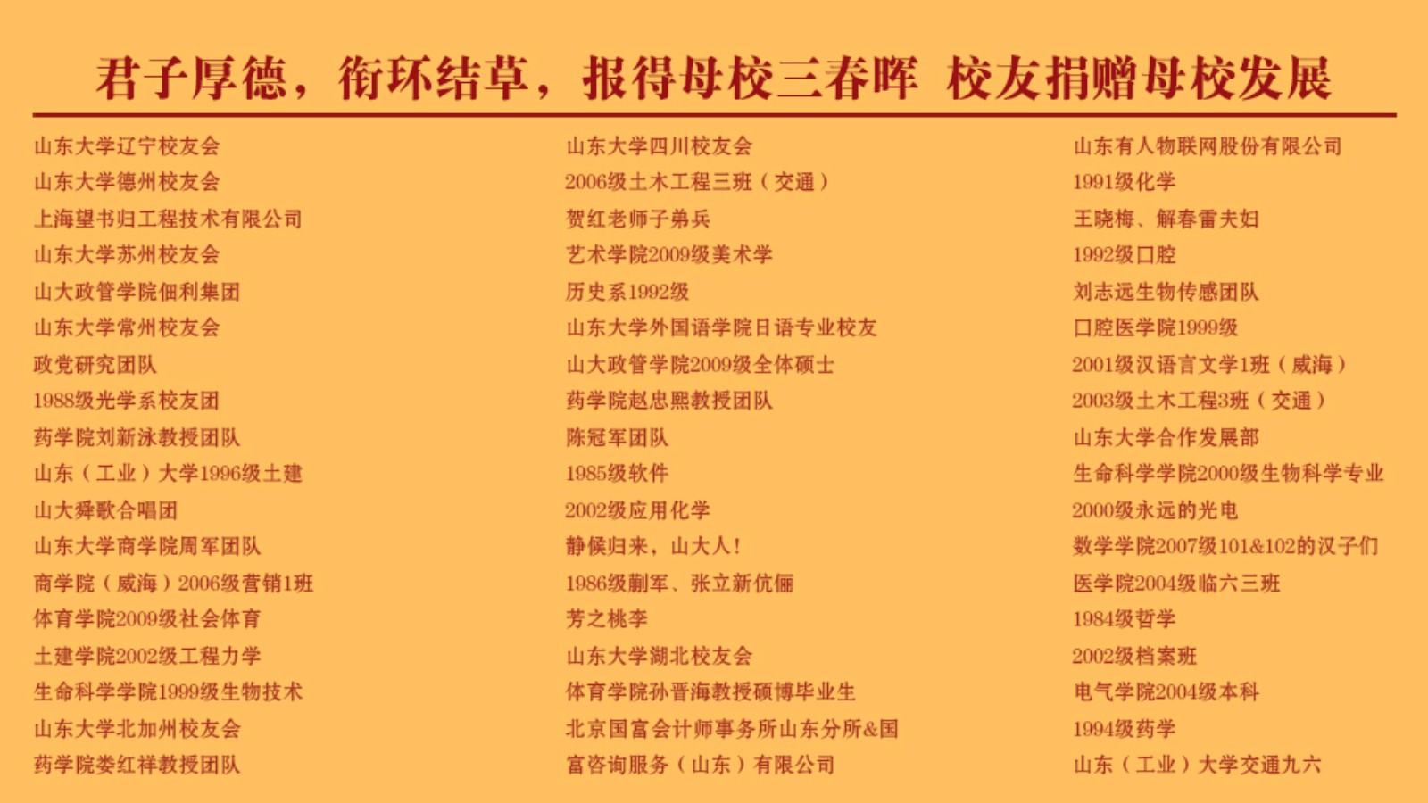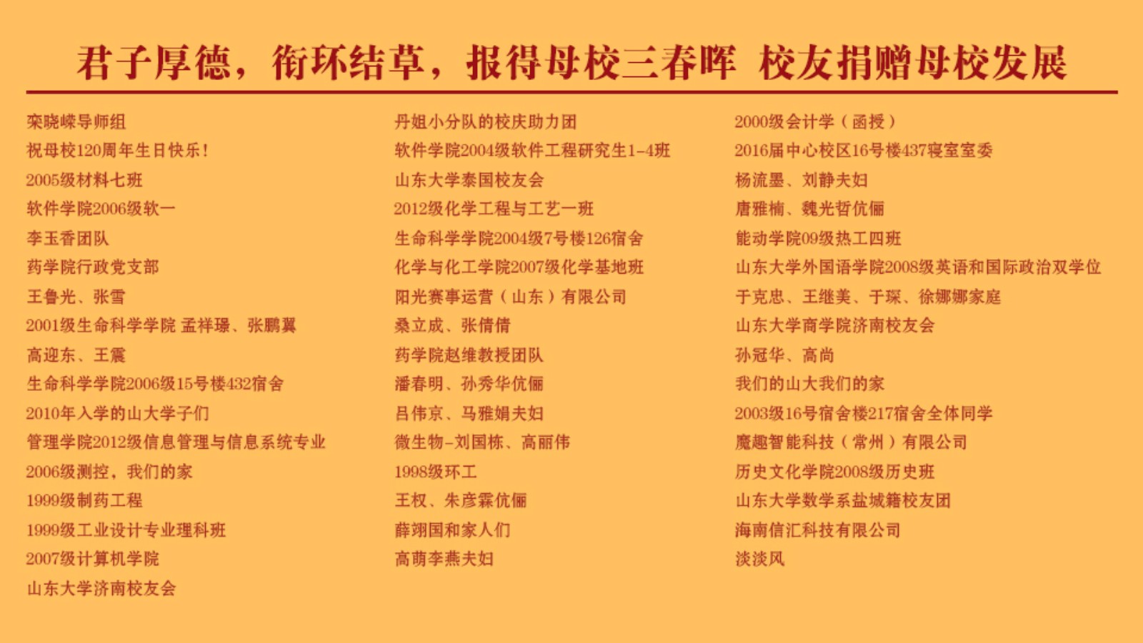 个人累计捐赠12000元以上或企业捐赠10万元以上,我们将邀请您参与校庆及新百廿基金颁奖等相关活动。
