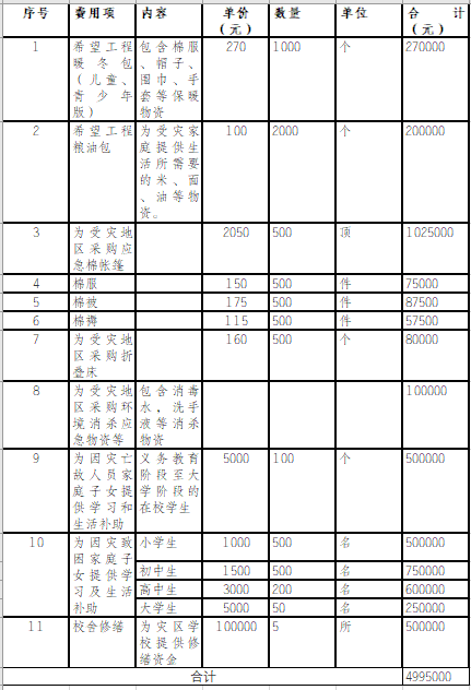 *由于灾情不断发生变化,采购的物资包括但不限于上述物资品类,其单价、数量等将根据灾区实际需求、市场价格、物流情况进行适当调整,具体发放的物资、资助金等以实际发放为准。