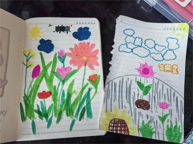 心崽小怡在看到学习礼包中有画笔的时候,眼睛都亮啦!社工便询问小怡:“你是不是很喜欢画画呀!”小怡点点头,社工询问小怡是否可以和我们的小志愿者一起画一幅画呢?小怡点点头,随后拿出画笔开始画,社工便在一旁陪着小怡,小怡和小志愿者画完后两人交换了作品,留作纪念。