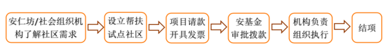 1、社会组织深入社区调研,了解需求,根据需求设立帮扶试点社区或帮扶试点村,向安基金递交项目请款书并开具发票,安基金项目组进行审核,财务进行审批,通过后,根据申请金额向社会组织机构进行拨款,社会组织负责义工招募、项目执行、资料递交和结项。具体操作流程如下图: