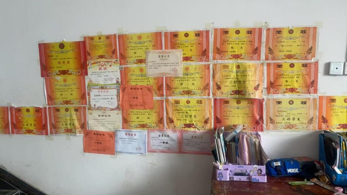 令人印象深刻的是,每个孩子家中都贴着满墙的奖状,黄红相间的鲜艳,成了这些苦涩、灰暗的家庭里最亮丽的色彩,也是整个家庭的最热切的希望。